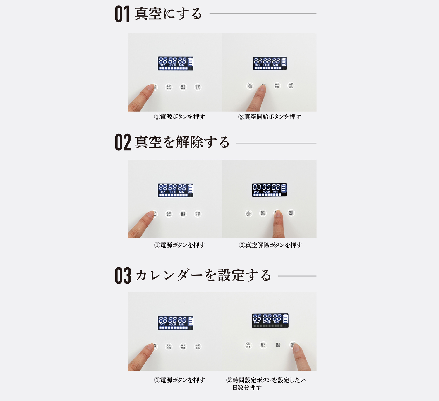 | A.食材の保管の「目安」の設定としてお使いいただけます。 真空開始日から好きな日時(99日以内)に設定できますので、食品の消費期限や賞味期限に合わせて設定していただくと、いつまでに食材を使い切ればいいかがわかり便利です。設定日時になってしまっても、アラーム音が鳴ったり、勝手に真空が解除される機能はついておりませんので、ご自身の目視確認としてのご活用をおすすめしております。また、日付のリセット機能もございません。戻したい場合は時間設定ボタンを必要な回数だけ押す、または長押しをし 、99日を超えますと1日に戻ります。 |